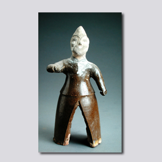 首都博物馆藏。泥质红陶。明器。武士形象。头戴两侧有护耳的尖顶兜鍪,兜鍪前面中心处呈尖状下凸,护住眉心,是一种比较实用的战士头盔。头部为模印预制后插入颈部的。上身穿筒袖铠,腰束带,下着裤。全身自颈部以下施褐色釉,颈部以上涂白粉,推测面部应原有彩绘,右手似执鞭,作驱车前行状,推测为车夫,形象简约。