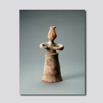 首都博物馆藏。泥质红陶,明器。模制。头发上梳,总于头顶成高髻,裹以头巾。睁目鼓腮,口圆张,挺胸收腹。上身赤裸,下着及地长裙。双手环抱于胸前,作歌唱状,推测为歌唱俑。
