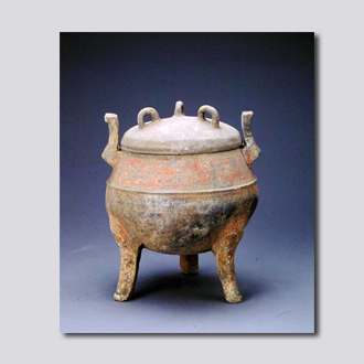 首都博物馆藏。泥质灰陶。微敛口,鼓腹,圜底,三兽形蹄足,口沿上双附耳,耳上刻划S形纹,半球形盖,盖面贴塑三卧兽为钮,腹部浅刻涡纹。陶鼎表面有朱绘痕迹。
