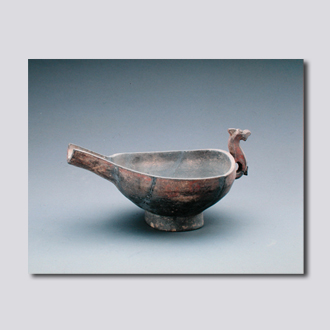 首都博物馆藏。泥质灰陶。仿青铜礼器。敞口,浅腹,平底,鋬为鸟首状,鸟尾为流。周身满绘朱彩流云纹。