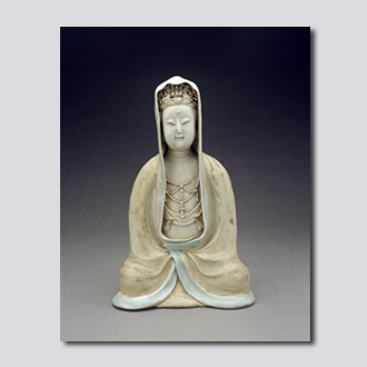 首都博物馆藏。结跏趺坐。宽额广颐,眉间饰白毫,丹凤目微倪,直鼻小口,梳高发髻,戴宝珠花冠,花冠正中有一小化佛。通体素白,仅袈裟边缘施青白色釉,露胎处原加饰金彩、贴金(已脱落)。袈裟自头顶披下,袒露出面部及前胸。胸前佩璎珞及丝带,塑像构思缜密,用粗线条捏塑形体及衣纹,面部及胸前塑造精细。胎质洁白细腻。容貌秀美,神情慈祥。