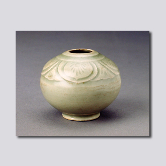 首都博物馆藏。收口,丰肩,鼓腹,圈足,足脊无釉。口沿下刻覆莲瓣纹,并划出筋脉。内外施青釉,口沿下有开片,釉层澄澈。胎体轻薄,造型精巧,是一件别具一格的文房用品。