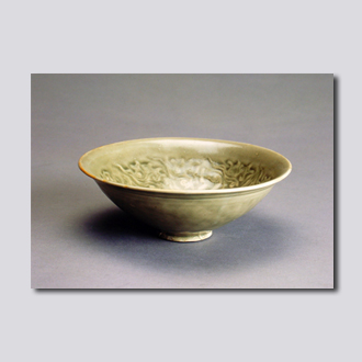 首都博物馆藏。撇口,弧腹,小圈足。足脊平削无釉,有窑渣痕。内外施青釉,碗内刻双鹤翔于云中,一鹤衔草,一鹤衔信札。釉色青绿,胎质细腻呈灰白色。构图巧妙,纹饰饱满,刻花有浮雕感。为耀州窑精品。