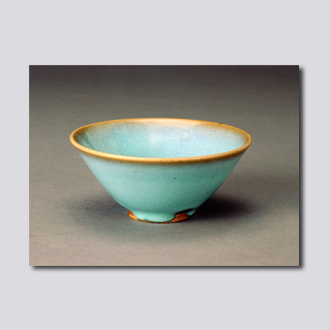 首都博物馆藏。敞口,斜直壁,圈足,足脊无釉。通体施天蓝色釉,口沿处釉垂流露出胎色。釉层凝厚有气泡,色调幽雅。