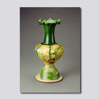 首都博物馆藏。翻卷五瓣花式口,细长颈,扁圆鼓腹,喇叭形圈足。腹部刻一周花卉纹,施黄、绿、白三彩釉,颈部施深绿色釉,釉色有细碎开片纹。整个器物,枝叶花瓣粗犷放达,色彩和谐,造型敦实俊美。