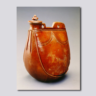 首都博物馆藏。泥质红陶。扁圆形,小口,塔式盖,凹底。底满釉,有三个支钉痕,通体施酱黄色釉。器身有仿皮囊壶的缝制痕迹。