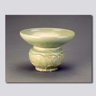 首都博物馆藏。碗式口,束颈,鼓腹,圈足。裹足支烧,足上有六块支烧痕。腹部凸雕三层仰莲瓣纹。胎质细腻,呈浅灰色。通体施青绿色釉,釉质浅淡透亮。其做法是将敛口碗去底保留圈足,卧于罐直口内,粘合而成。