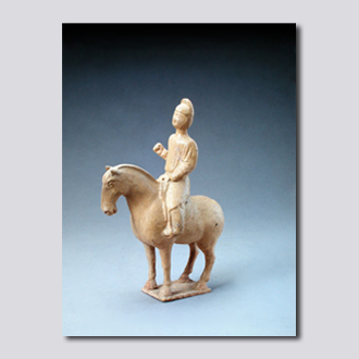 首都博物馆藏。明器。男俑与马俑为分别模制后再捏合一体,男俑头戴幞头,身着右衽窄袖圆领长袍骑于马上,足蹬长靴,左手扶鞍桥,右手执物(已失)。马立于长方形扁平托板上,鞍鞯俱全,神态驯顺。通体施黄釉,釉面有细碎开片。