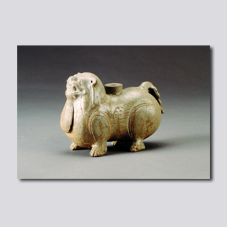 首都博物馆藏。辟邪昂首站立,长须,垂尾,背部有管状插口,腹部两侧刻划有翼。四肢劲健,肌肉丰满。釉层薄而透亮。辟邪是我国古代传说中的一种神兽,似狮而带翼。瓷辟邪最早出现于三国东吴时期。