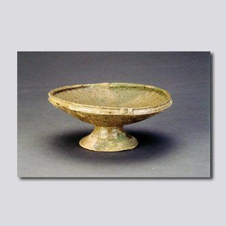 首都博物馆藏。收口,浅盘式腹,喇叭形高足。口沿外侧有三组贴塑装饰。通体施青釉,釉层较薄而不均匀,胎呈浅灰色,造型不规整。