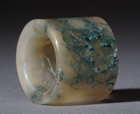 天然花玛瑙质地,可见棕色和白色丝状花纹,半透明,筒形,光素。 扳指又称“班指”或“搬指”,是古代拉弓射箭时戴在拇指上的护具,古代称为器厂(音“射”)。早在新石器时代晚期至商周,扳指多由皮质等一些软质材料制成,也可见一些硬质材料。随着朝代更迭,扳指的实用功能日渐式微,装饰功能逐渐增强。早期的扳指较长并带有槽痕,战国时期开始变短。汉代出现玉片形状,类似于玉佩,带有用来拉弦的小钩,这时候的扳指已经不能承受拉弓时的巨大压力。 |
