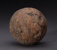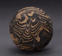 器物圆球形,泥质绞胎,古称捶丸,是一种徒步用棒击球的运动。从宋代至明代都十分盛行,是从古代的一种球类游戏——击鞠演变而来,唐代又称步打球。玩时在旷地上画一球基,距球基数十步至百步远的地方,挖一定数目的球穴(也称“家”),穴旁竖有彩旗,人在球基处用球棒击入穴中。有两人和多人分队玩,改玩法与现在流行的高尔夫球相似。 |