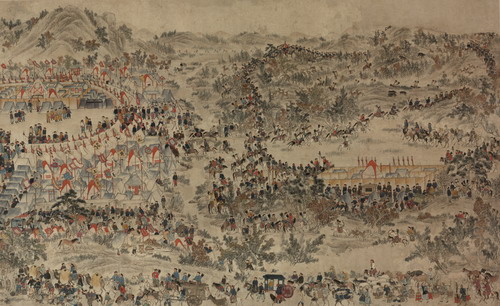 该图取材于清代帝王在围场(今河北省围场满族蒙古族自治县)秋猎的“木兰秋狝大典”,与承德避暑山庄藏清代满族画家兴隆阿所绘的《木兰秋狝图》内容相似。画面分为御营(大营),看城与合围场,以及街肆三大部分。御营居左,宛如城池规划,有八旗守卫。御营按照天圆地方的理论设置为内方外圆,中间是皇帝御幄,御幄外为黄幔城。黄幔城外是内城,开三门,正白旗南,镶黄旗东、正黄旗西,另有镶蓝旗驻御幄之北;外城开四门,镶白旗东、镶红旗西、正蓝旗南、正红旗北。外城南设各兵部、户部、奏事处等部司衙门。 看城与围场是有机整体,表里相联。康熙有诗云:“两旗合帐殿,千骑列云涯,试看止齐势,端称左右宜”。这首诗反映了看城与围场的密切关系。