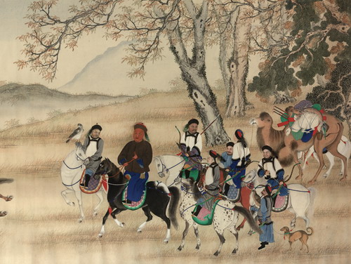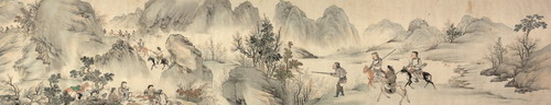 僧忠亲王行猎图卷 清 纸本设色 纵114厘米,横231厘米 外围 纵123厘米,横261厘米 首都博物馆藏