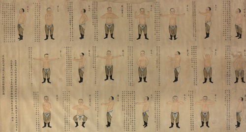 气功图卷 清 佚名 纸本设色 纵88.7厘米,横163.5厘米 外围 纵100厘米,横201厘米 首都博物馆藏 |
