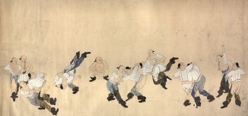 图中15名躀跤手身穿满族传统套裤,发辫束起,其中有五组人物,两两成对,正施展扑、拉、甩、绞等技巧制服对手,另外五人聚在周围,或整理衣服,亟待上场,或细细端详,领会要领,此画展现了摔跤不仅能强身健体,更具有很高的观赏性和娱乐性。 清朝是摔跤(又称躀跤)发展的一个鼎盛时期。除了用于训练军队等的“官跤”之外,民间在东四、西四、西单、日坛、月坛等地还出现了很多供老百姓游戏休闲的“私跤”场所,其中天桥跤场是当时最有名的一个。 |