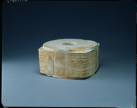 被誉为琮王。器形呈扁矮的方柱体,中有对钻圆孔,内圆外方,俯视两端如玉璧形。转角布列简化神徽纹,四个柱面上下各有一神徽纹。古代