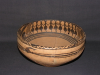 此盆为细泥,以黑彩在内壁绘两组舞蹈人像,分别为