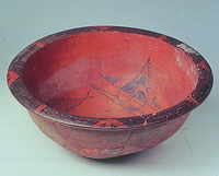 葬具,为儿童瓮棺的棺盖。盆内壁用黑彩绘出两组对称的人面鱼纹:人面概括成圆形,额上涂成黑色,可能是当时的文面习俗。嘴旁、耳旁各有相对的两条鱼,构成形象奇特的人鱼合体。头顶的尖状角形物可能是进行某种宗教活动的化妆形象,而人面鱼纹则可能是代表人格化的独立神灵