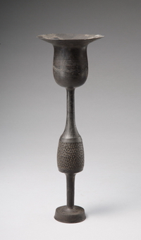 因胎壁薄如卵衣,故名“蛋壳陶”。此杯上部为宽口沿的杯身;中部为柄,柄两端细,中间圆鼓中空,有透雕,好像一个含苞待放的花蕾,其内放置一粒陶丸,将杯子拿在手中晃动时,陶丸碰撞笼壁会发出轻脆的响声,杯子站立时,陶丸落定能够起到稳定重心的作用,设计十分巧妙;下部是覆盆状底座。杯和柄分别轮制后粘接而成。整体形态纤巧细致,雅致高贵,器身光洁细密,非常规整,是当时最高级的一种饮酒器。它以其高超的制作工艺和优美的造型,被誉为