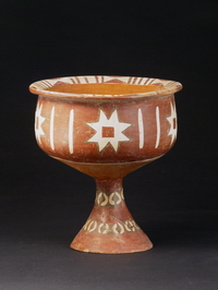 豆为盛食器,也是祭祀用的礼器。此豆口沿上用褐、红彩绘对顶三角形与若干线条相间组成的图案,腹部用白彩在深红色陶衣上绘有