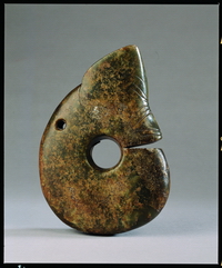 墨绿色玉琢磨而成。猪首双耳竖起,两眼相对圆睁,吻前伸,口微张,鼻间有阴刻皱纹。龙体蜷曲无足,像蛇身,首尾相接处缺而不断,背部对穿一个供系挂的小孔。此物一般用作祈求吉祥和护身符悬挂在胸前,反映了先民对美好生活的向往和对平安的企盼;也是代表某种等级和权力的祭祀礼器。