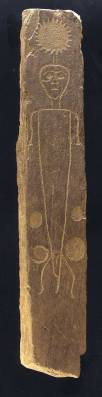 这是我国目前发现最早的“太阳神”石雕像。先人用写意的手法雕刻出一位身躯修长、两手下垂、双足分立的人,头顶上刻着有