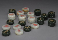 此副象棋分白玉、碧玉两色,每色各16枚棋子。其中白玉棋子阴刻字描红,碧玉棋子阴刻字填金。 象棋相传始创于先秦时代,后经过长期的流传演变,至南宋时成为家喻户晓的娱乐活动。明清时期象棋更为普及,深受广大百姓的喜爱。关于象棋的著作也多产生于这个时期。如明朝嘉靖元年(公元1522年)出版的《百变象棋谱》、明朝庚午年(公元1570年)出版的《适情雅趣》、崇禎五年(公元1632年)出版的《桔中秘》等等。