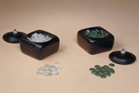 此幅围棋分碧玉、白玉两色,每色各185粒棋子。附紫檀玉顶盒两个,盒盖顶为白玉钮,钮中饰金属花形蕊。 围棋是中国最古老的棋戏之一。从《左传》、《说文解字》涉及的相关内容来看,至少在春秋时期,围棋竞玩已较普遍。唐宋及明清,围棋获得了更大的发展,广泛流行于文人和显贵之间,它既是一种竞技游戏,也是重要的社交手段。早期的围棋多为木质,至于玉质围棋的始现,目前最早见于唐史料的记载。 |