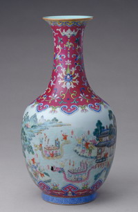 此瓶足内红彩书“大清道光年制”六字篆书款。瓶内及底足施松石绿釉,瓶外以粉彩装饰,颈部及近足底处以紫色为地,粉彩绘象征吉祥意义的宝相花、蝙蝠纹,腹部绘两龙舟于水中,船上及岸边站满了童子,有的用力划浆,有的呐喊助威,极具生活情趣。 龙舟竞渡作为中国传统的娱乐活动最迟始于汉代。唐以前,普遍开展于江南地区,唐以后逐步北移,随帝都的迁移而流传于黄河流域。此活动场面早在宋元时期就以书画的形式被记录下来,清中期开始,作为主题装饰出现在了宫廷御用瓷上,以道光时期的粉彩器为最多。 |