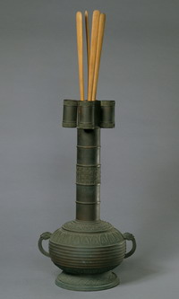 铜投壶(附箭四支) 清 高57厘米,上口直径16.5厘米, 底直径31.5厘米,箭长85厘米 故宫博物院藏