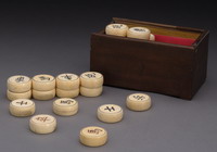 棋子由象牙制成,棋子均双面刻字并染红、蓝两色各16子,共32枚,贮一木匣中。 象棋脱胎于古代两军作战时,行兵布阵的政治军事格局:“楚河汉界”比拟了古代的“楚汉战争”;车、马、炮、卒(兵)、象(相)、士(仕)、将(帅)均代表着古代军队里的兵种或职务。相对于围棋所蕴含的道家思想,象棋积极攻杀的作战法则折射出儒家入世的精髓。象棋的起源说法很多,但对宋代象棋基本成型的认识比较统一。宋代《世林广记》中有目前所能看到的最早象棋谱的记载,它比西方最早的国际象棋谱还要早200多年。