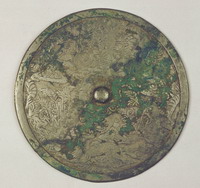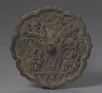 在许多古代书画家的作品中都可以看到弈棋的场景,弈棋纹在铜镜上的出现,正说明了这种活动的普及。此镜扁平圆钮,花瓣形钮座,凸起素宽沿。用浅浮雕手法雕刻出的山石和树丛将整个镜背自然的划分成四区。上区树下三人,两人对弈一人观战,方形棋盘清晰可见。下区四人围坐一物,惜缺损分不清为何物。左区和右区各两人均坐姿。