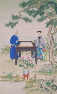 孝钦后(1835—1908年)是清入关后第七任皇帝咸丰帝奕詝的皇贵妃,姓叶赫那拉氏,咸丰十一年(1861年),文宗奕詝病逝,孝钦被尊为慈禧皇太后。 孝钦后是一个多才多艺之人,诗文书画及棋艺等方面均有一定的造诣。此图描写的就是孝钦后在兰卉绽放的皇家园林内下围棋的情景。