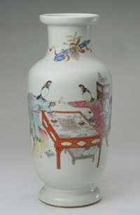 瓶盘口,短颈,长腹,圈足。通体白釉上以粉彩为饰,瓶颈绘博古、琴、扇等图案,腹部绘仕女对弈图,图中两仕女身着汉服,分坐棋盘左右,正在兴致勃勃地对弈搏杀,一小童伏在桌旁好奇观看。此瓶造型隽秀典雅,釉色洁白莹润,色彩柔和绚丽,所绘人物形象、神态,栩栩如生。