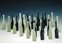棋子成细瓶状,平底内凹,顶为花蕾形钮。分白玉、碧玉两色,每色各15枚。 双陆棋盛行于南北朝、隋唐及宋元时期,在辽、金社会尤为风靡,但清朝时失传,是一种类似赌博的棋戏。相传是在天竺(印度)传入的波罗塞戏基础上,由曹植糅合六博的特点而创设。初期有两枚骰子,唐朝末年后逐渐加到六枚。双陆棋子为马,做椎形,黑白各十五枚。两人相博,掷骰子按点行棋,白马自右归左,黑马自左归右,先出完者为胜。