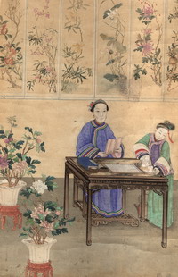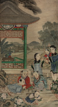 游廊旁,三位儿童围在一起斗蟋蟀,引来一大一小两位女童怀抱着红衣孩提也前来观看,图下方有一孩童正俯身捉拿从罐中逃跑的蟋蟀。整个画面人物之间彼此呼应,神情连续,生活气息浓郁,富有情趣。 “斗蟋蟀”不仅孩子们喜欢,更是许多成年人着迷的玩意。过去老北京人除了爱养鸟之外,另一个嗜好就是“养蝈蝈”,上至王公贵戚,下至平民百姓,都对此乐此不疲。甚至还有善养蟋蟀的主儿专为大户人家养这“玩意儿”,混口饭吃,也算是三百六十行中的一技这长,俗称“蛐蛐把式”。