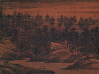 该图描绘江南渡口夏日景色,开卷处平沙浅岸,江河横陈,小舟往来其间,山峦叠起,丛林中微露村舍,卷末沙岸延伸,垂柳成行,岸边有待渡者,展现出平远辽阔的江景。全卷用披麻皴加墨点表现山峦林木,画法与《潇湘图》基本一致,尺寸和质地似乎可与《潇湘图》相接,有学者因此认为两图本系一幅,是董源《河伯娶妇图》中的两个段落。画面以平远取势构图,在平平淡淡的浑朴真实里“得山川之神气”,设色雅淡,艺术感染力得到了充分地发挥。 |