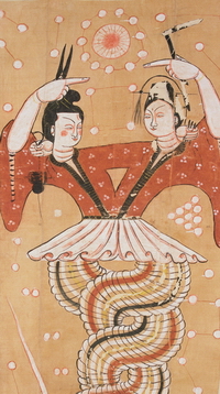 捐画绘伏羲在左,左手执矩,女娲在右,右手执规,人首蛇身,蛇尾交缠,头上绘日,尾间绘月,周围绘满星辰。构图奇特,寓意深刻,富于艺术魅力和神秘色彩。这种图像在吐鲁番地区古墓中多有发现,一般出自夫妻合葬墓,用木钉钉在墓顶上,少数则折叠包好放在死者身旁。伏羲女娲是我国古代传说中的天神和人类的始祖,据说伏羲教导人们从事生产,女娲教导人们婚姻伦理。他们手持规矩,既是生产工具,也是社会秩序的象征。联合国教科文组织杂志《国际社会科学》
