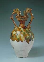 ,有白瓷、青瓷、三彩等品种,唐代主要流行于东都洛阳一带,巩县窑烧制双螭瓶的重要产地之一。陶瓷器上的龙多为雕塑龙,而龙的地位因象征皇帝而日益尊贵,当时宫廷有严格规定,除皇帝以外任何人不准用龙纹作装饰。这件三彩双龙耳瓶器型端正,保存完好,属唐代三彩瓷器的精美之作。 |