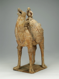 骆驼高大健壮,双峰间驮着装满丝绸、珍宝之类的沉重皮囊。皮囊上坐着正在持饼进食的胡商。该俑是中亚或西亚商人劳碌奔波于丝绸之路的真实写照。中世纪的中国具有超强的综合国力和丰富的物产,吸引了无数胡商千里迢迢来到中原。“沙漠之舟”