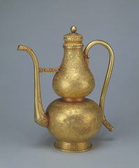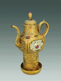 执壶呈葫芦形,圆形盖,宝珠形钮,通体錾刻花纹。造型秀丽,纹饰丰满,技艺娴熟,是清代皇帝的御用酒具。 |
