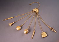 。每件小缀物都极精巧,尤其是罐、瓶、袋、盒通体錾刻精美纹饰,极富装饰性。 |