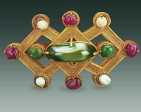 采用多种工艺技法精工细作而成,底部为三菱形和卮杯形组成的花丝金托,灵芝形圆钮。正中镶嵌猫眼石,四周装饰红、绿宝石及珍珠。此猫眼石晶莹灵动,为世间罕见之奇珍。 |