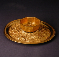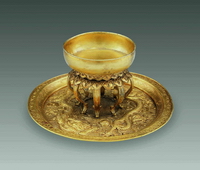托盘中央立一绣墩形承盏座,錾刻云龙、八宝等纹饰,座口下折成二层,饰如意云头纹,其下为十六个覆莲纹,造型精巧别致、典雅大方,是明代宫廷金银细作中的精品。 |