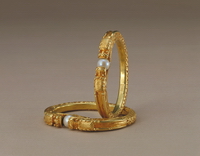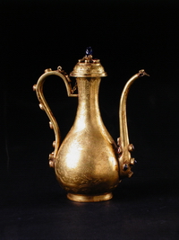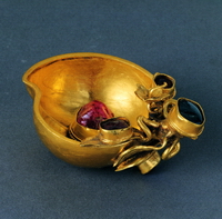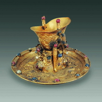 此杯集范铸、焊接、镶嵌等工艺于一体,杯体为桃形,构思巧妙,杯柄为桃枝与桃叶,杯中与柄部镶嵌红、蓝宝石,制作考究,富丽华美。 |