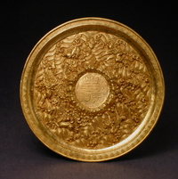 盘圆形,唇边。以范铸、錾花与捶打工艺制成,盘沿为二方连续回纹一周,盘心为一双钩篆书