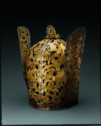 朵灵芝,显示民族文化间的交流与融合。冠内原有丝绸衬帽。此冠制作精巧,工艺华丽,彰显贵族气派,是契丹贵妇之冠。 |