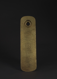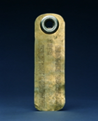 金质,两面刻八思巴文,意为:借助长生天力量,皇帝的名字是不可侵犯的,不尊敬服从的人,将被定罪致死。 |