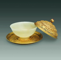 弧面形金盖,与白玉碗子母扣合,顶部为嵌红宝石莲花形钮,盖面为三层阶梯状,以镂空云纹为地,饰赶珠龙纹,托盘亦饰云纹与赶珠龙纹。整器构思巧妙,造型规整,纹饰繁复,尽显帝王用器之豪华。 |